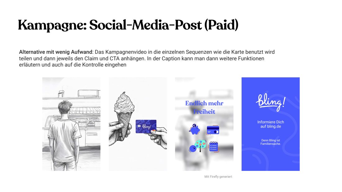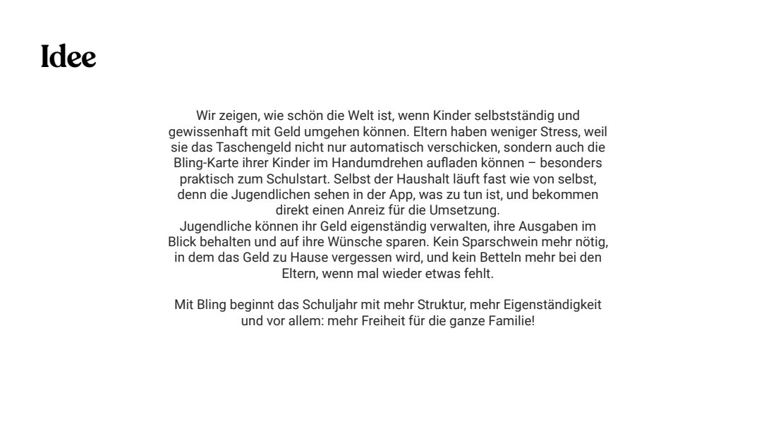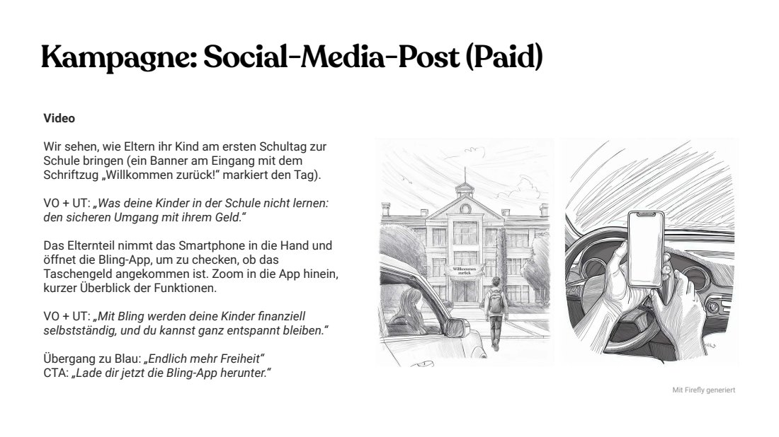 Based on my findings, I developed the core concept for the campaign. The idea was to emphasize how Bling allows both children and parents to manage finances in a stress-free and educational way, especially at the start of the school year. The concept focused on freedom, responsibility, and simplicity for both parties.